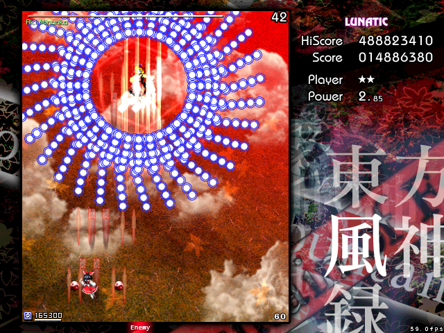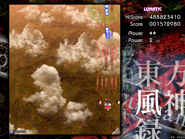 東方風神録ルナティックをとにかくノーコンティニューでクリアする為のステージ1攻略パターンを解説します。初めてご覧になる方はお手数ですが先に下記ページから閲覧をお願いします。